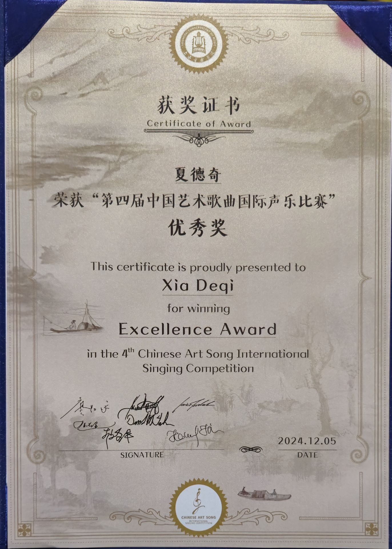 近日,备受瞩目的第四届中国艺术歌曲国际声乐比赛在上海音乐学院贺绿汀音乐厅圆满落幕。经过激烈角逐,省歌舞剧院夏德奇凭借出色的表现,荣获本次比赛优秀奖。