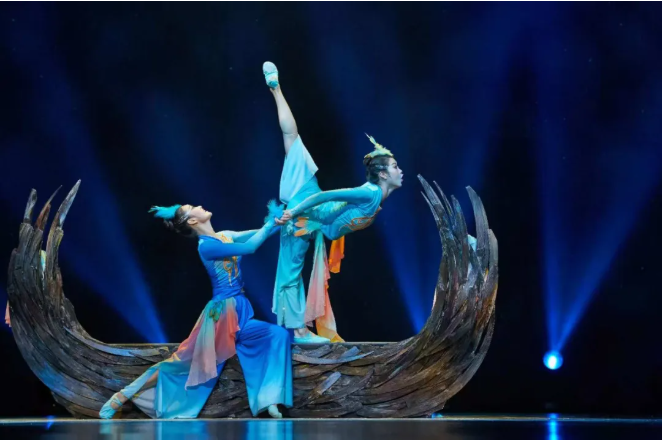 《并翼》以安徽花鼓灯艺术为基础,通过双人舞者的默契配合,生动展现了鸟儿的俏皮、欢快与灵动,寓意着生命的活力与希望。